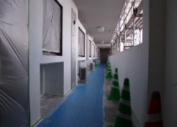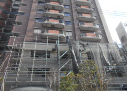 建物の周囲に仮設足場を設置し、飛散防止シートを用い、養生します。また、住居者の皆様の安全確保の為のガードマンの配置、安全通路の確保、侵入者の侵入防止対策等が、仮設工事の内容となります。