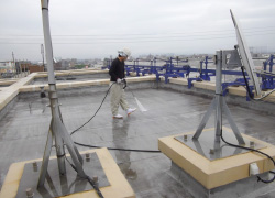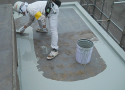 バルコニー・共用部廊下などの側溝部には、ウレタン塗膜防水工法を。屋上・ルーフバルコニー等、直接外気にさらされる部分の防水には、ガラスクロスを敷き込んだX2工法、またはシート防水工法等を用います。室内への漏水を防ぐ大切な工事です。