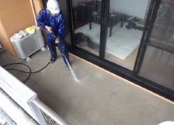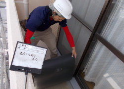 共用部廊下やバルコニー、階段等の床に防水性・防滑性に優れた、長尺塩ビシートを張ってゆきます。美観の向上にも大きく貢献できる行程です。 通常、塗装工事終了後の施工になります。